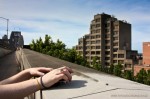 - A strange building and Sydney Harbour Bridge walk, hands holding a digital camera